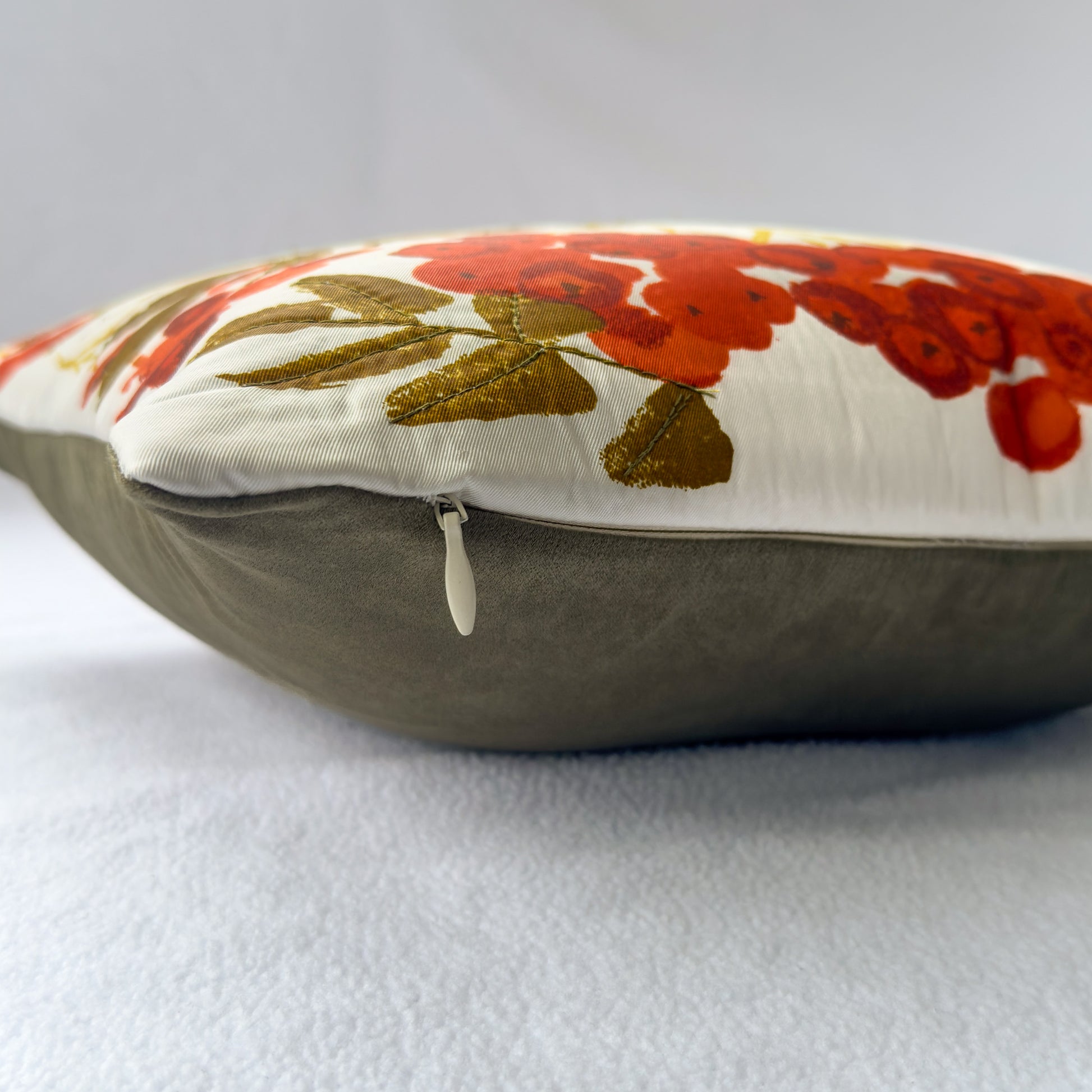 Transform your space with this unique upcycled scarf throw pillow featuring a striking cherry and leaf pattern, now repurposed as an elegant home decor cushion. Perfect as a bedroom accent piece or living room comfort companion.