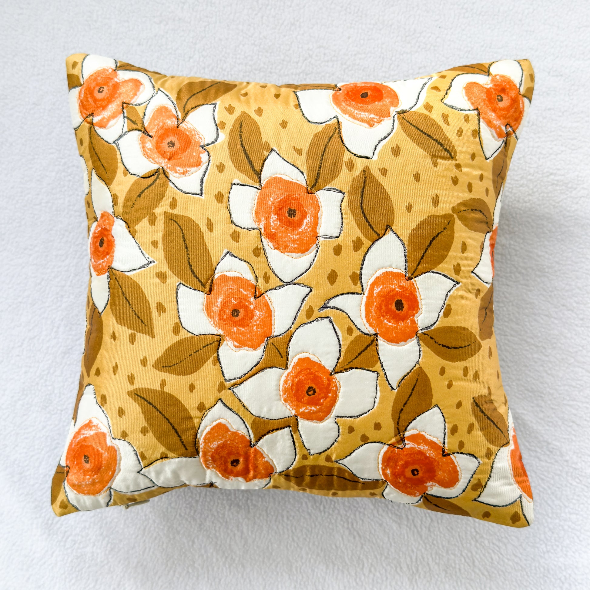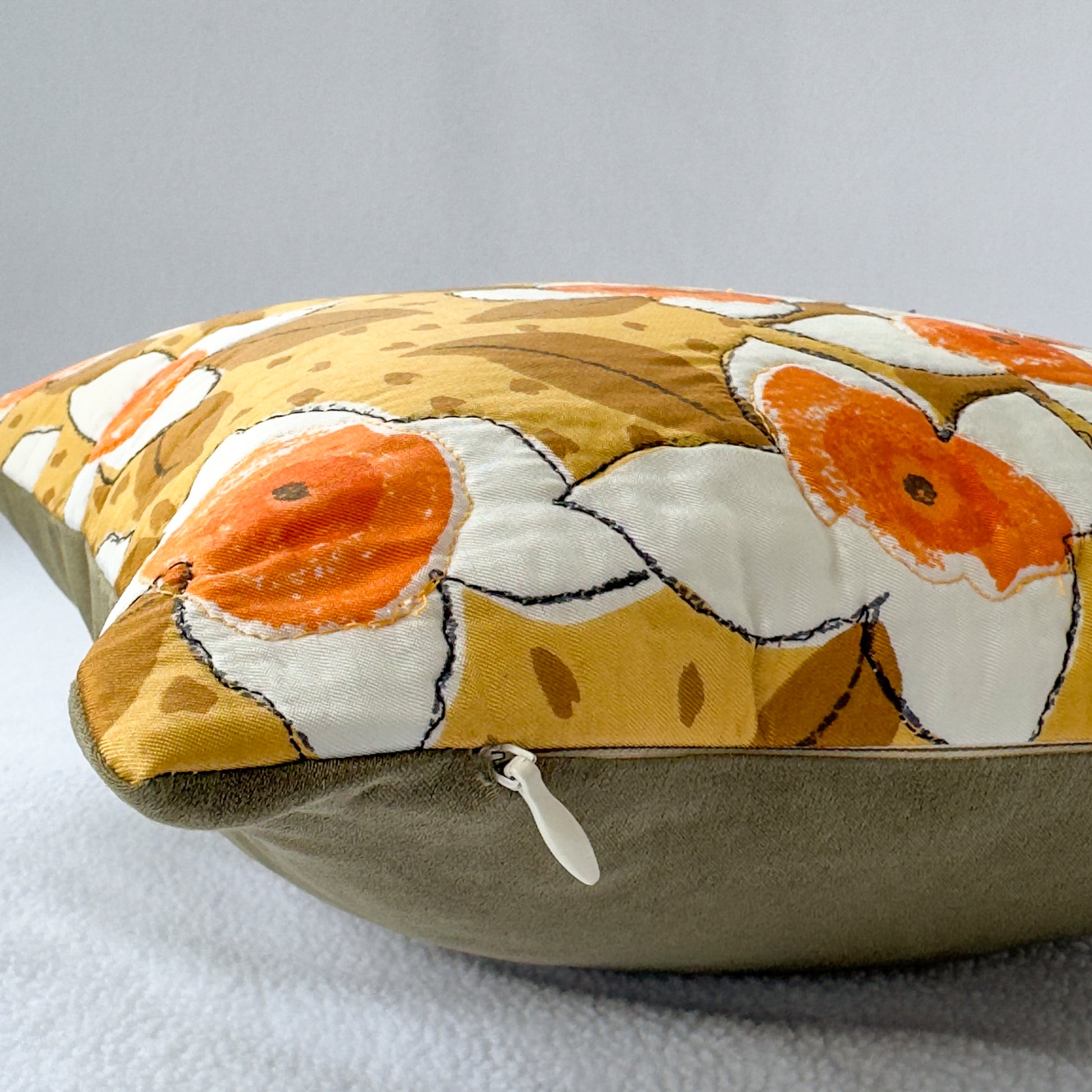 Update you space with this unique upcycled vintage scarf throw pillow featuring a retro orange floral print, now repurposed as a fun statement pillow. Perfect as a bedroom comfort companion or living room accent piece.