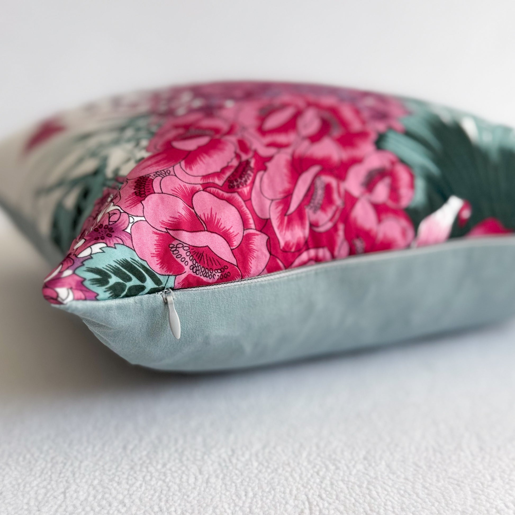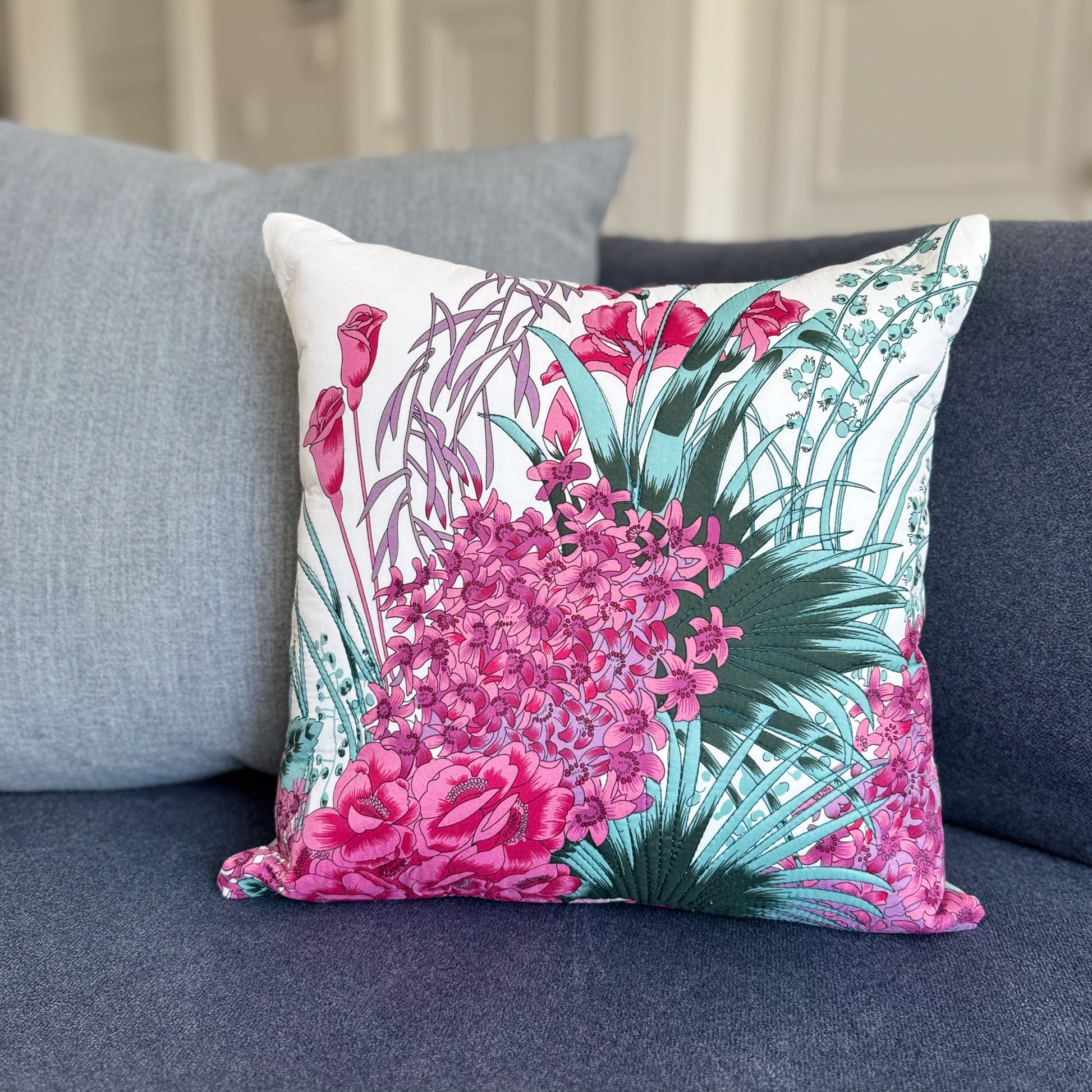 Transform your space with this unique upcycled scarf throw pillow featuring a beautiful floral pattern and garden print design, now repurposed as an elegant home decor cushion. The hidden zipper adds a touch of sophistication to this versatile housewarming gift, perfect as a bedroom accent piece or living room comfort companion.