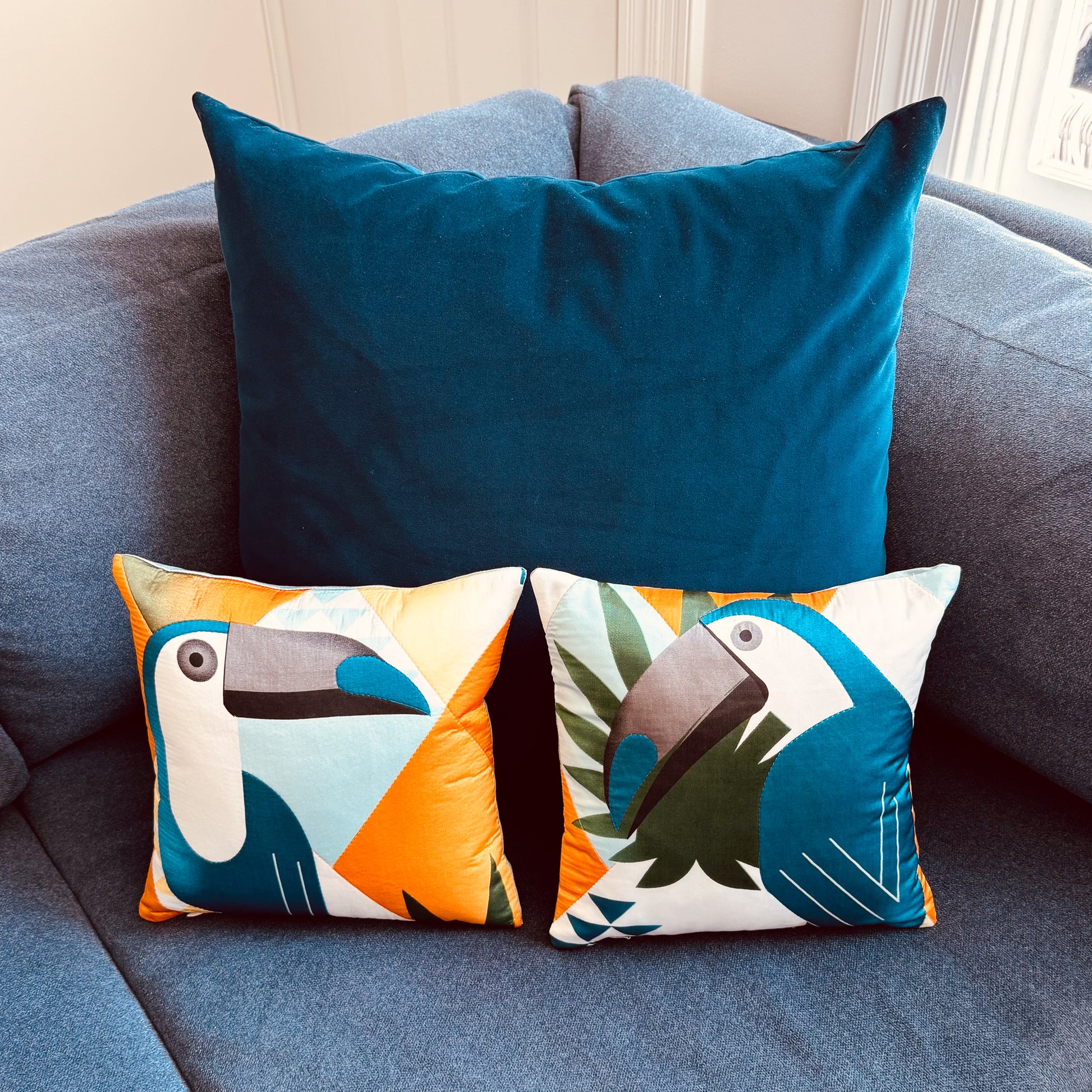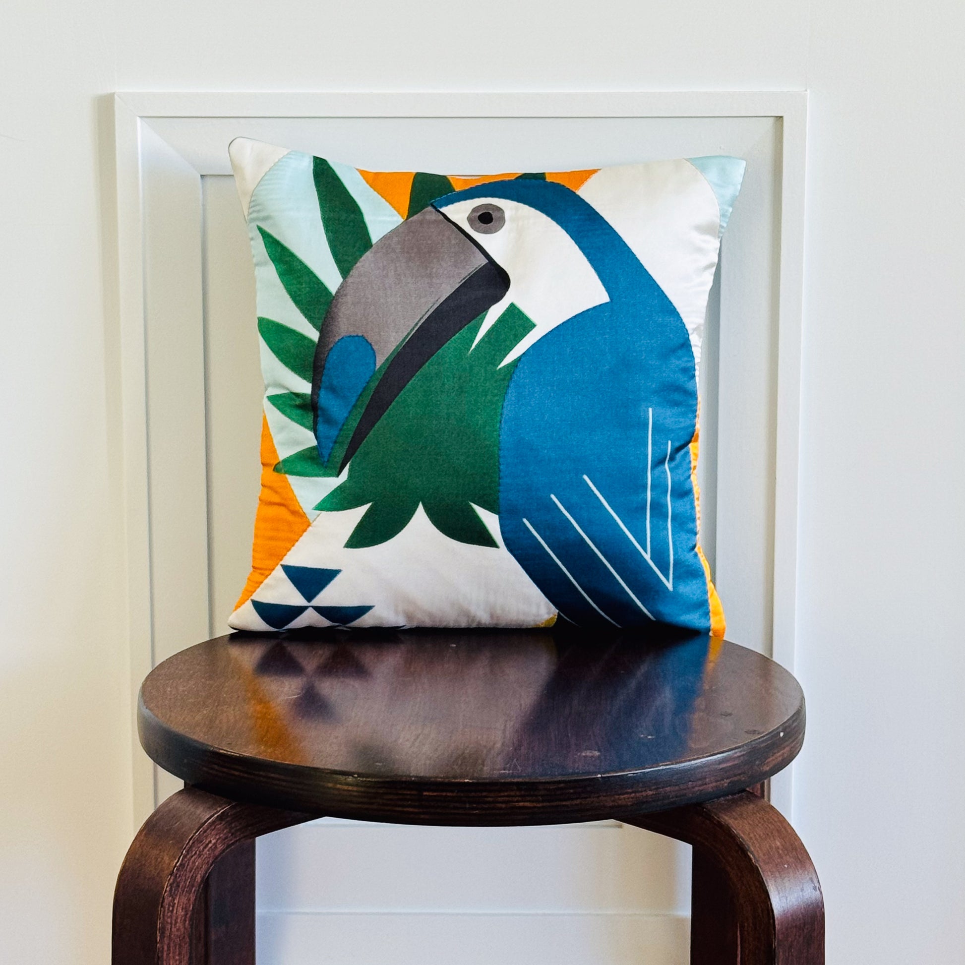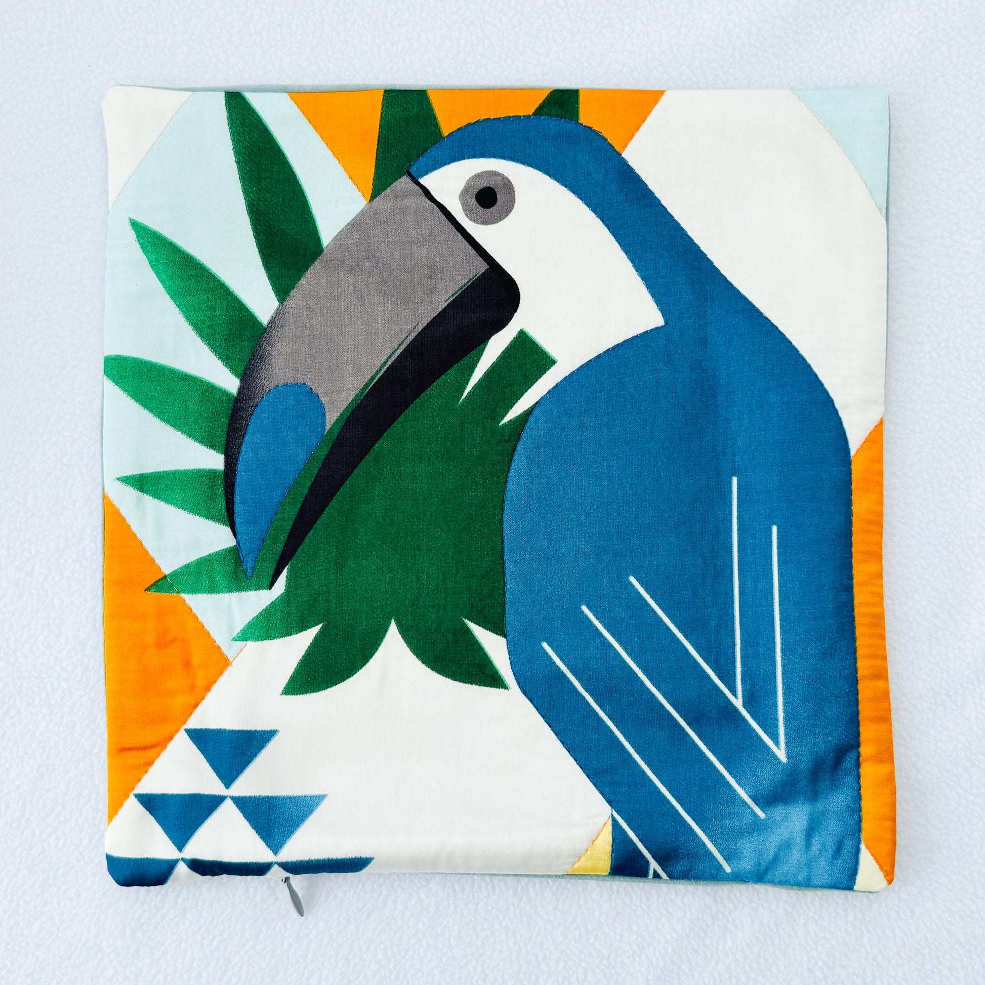 * Features bold blue, orange, green, and white color block with a vibrant geometric toucan pattern design