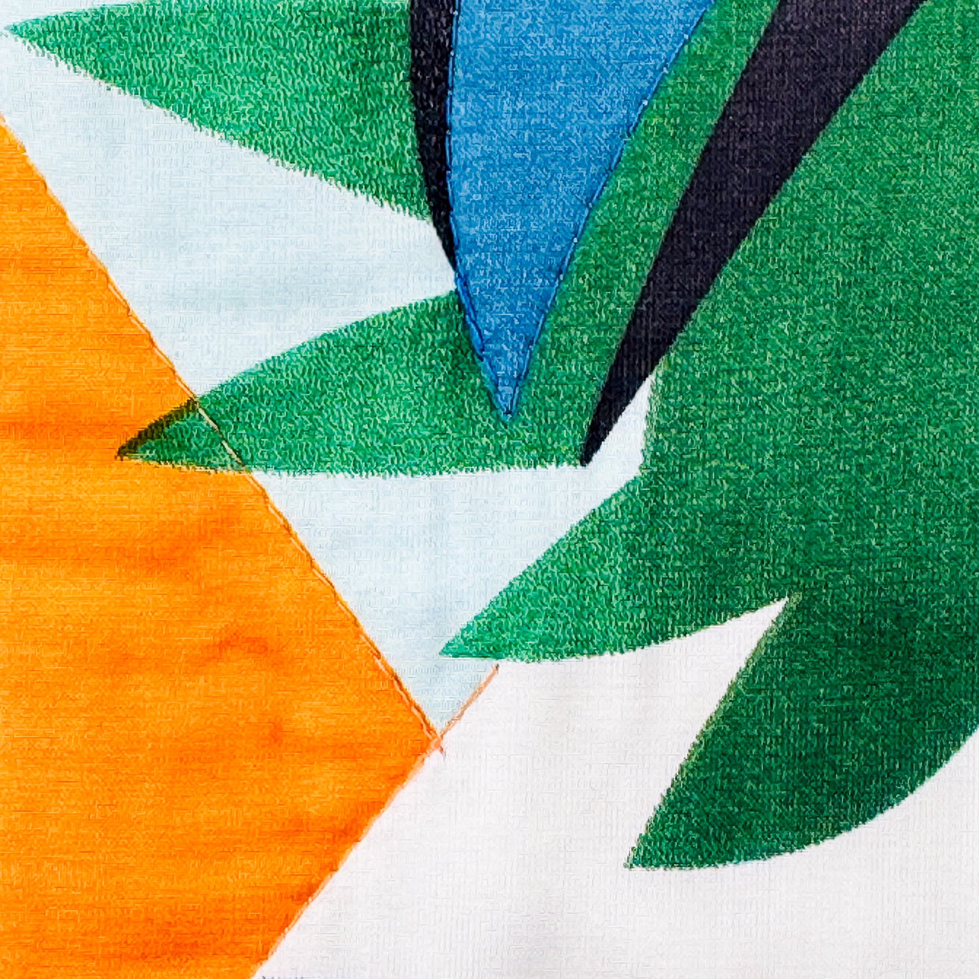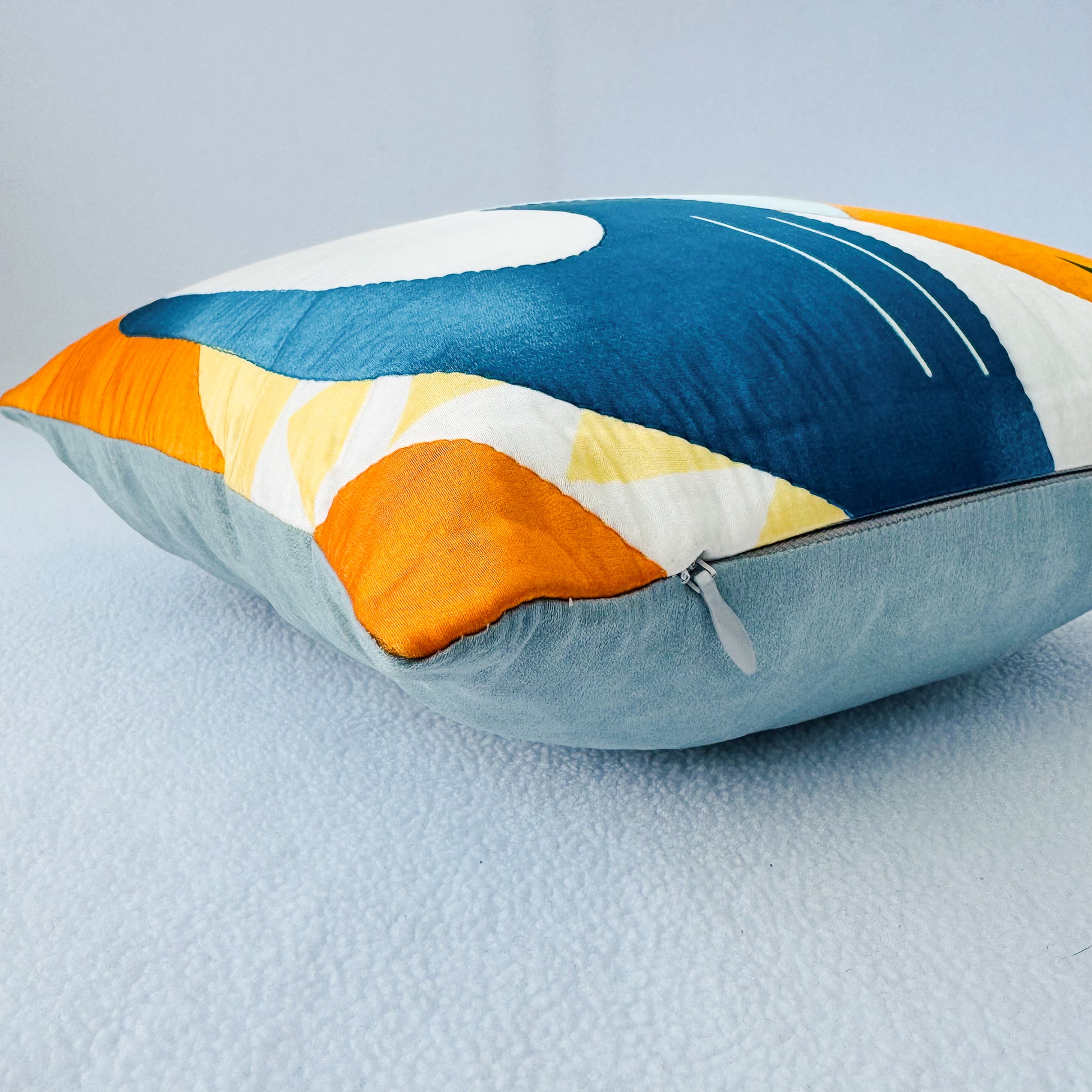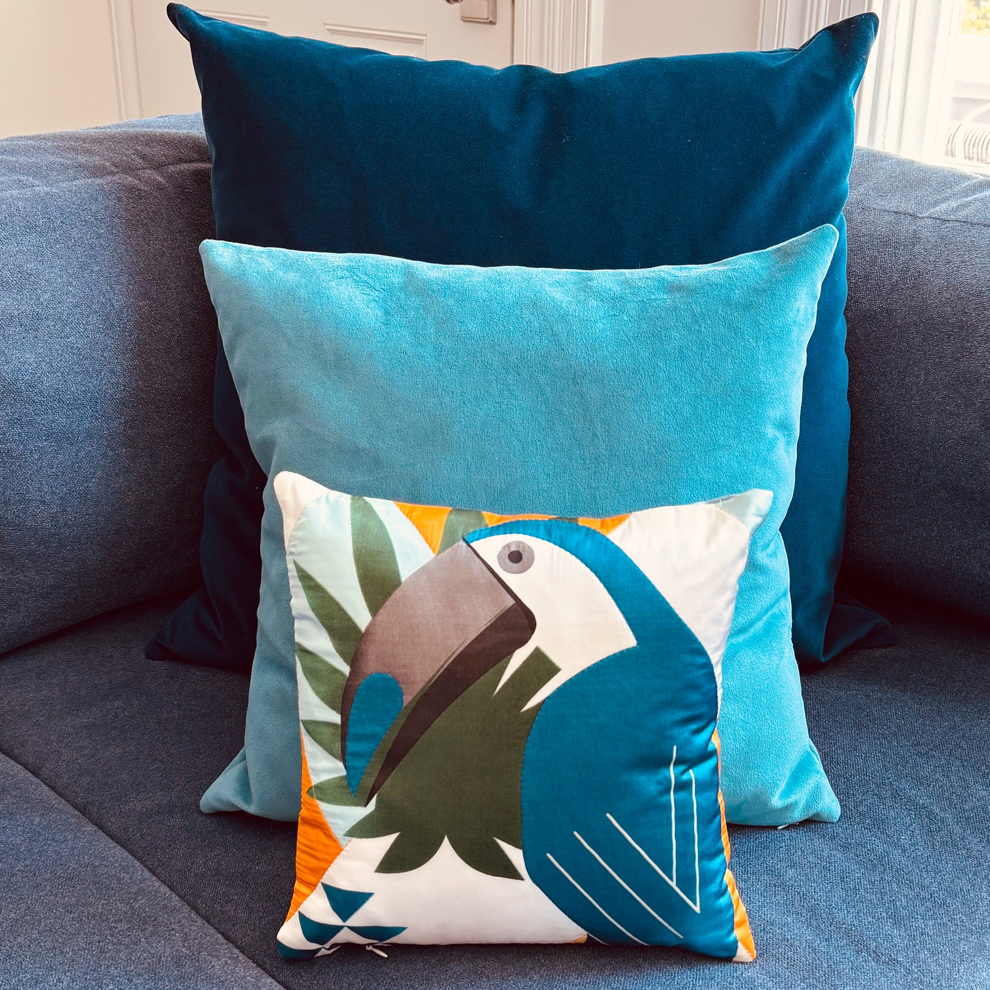 * Features bold blue, orange, green, and white color block with a vibrant geometric toucan pattern design