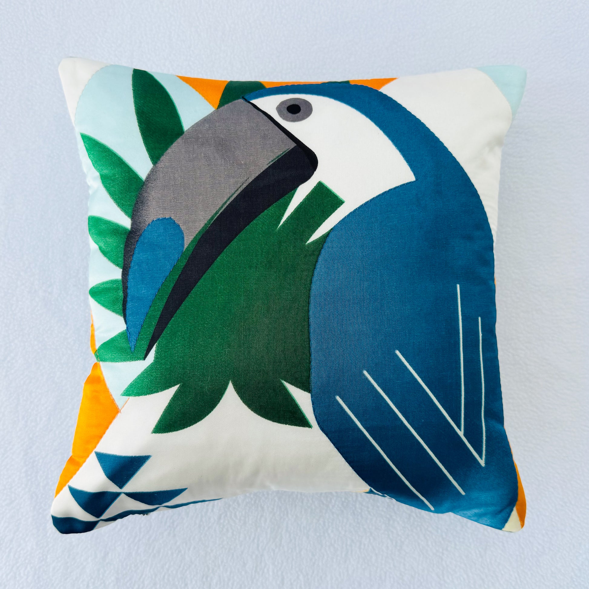 Add a vibrant tropical touch to your space with this geometric toucan pillow featuring a modern bird pattern that serves as a perfect living room accent piece. This square cushion's striking bird design incorporates deep blue, orange, green, and white color blocks, creating an eye-catching home decor piece that complements any tropical style setting.