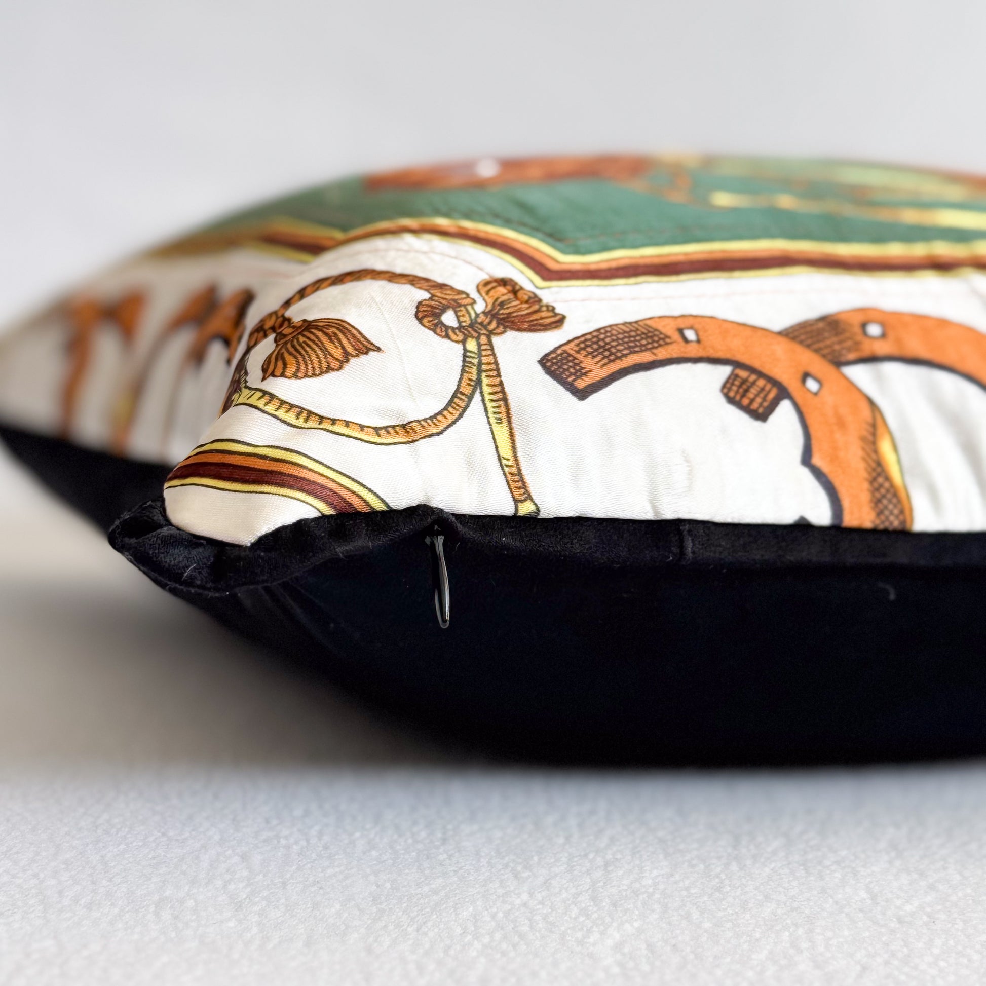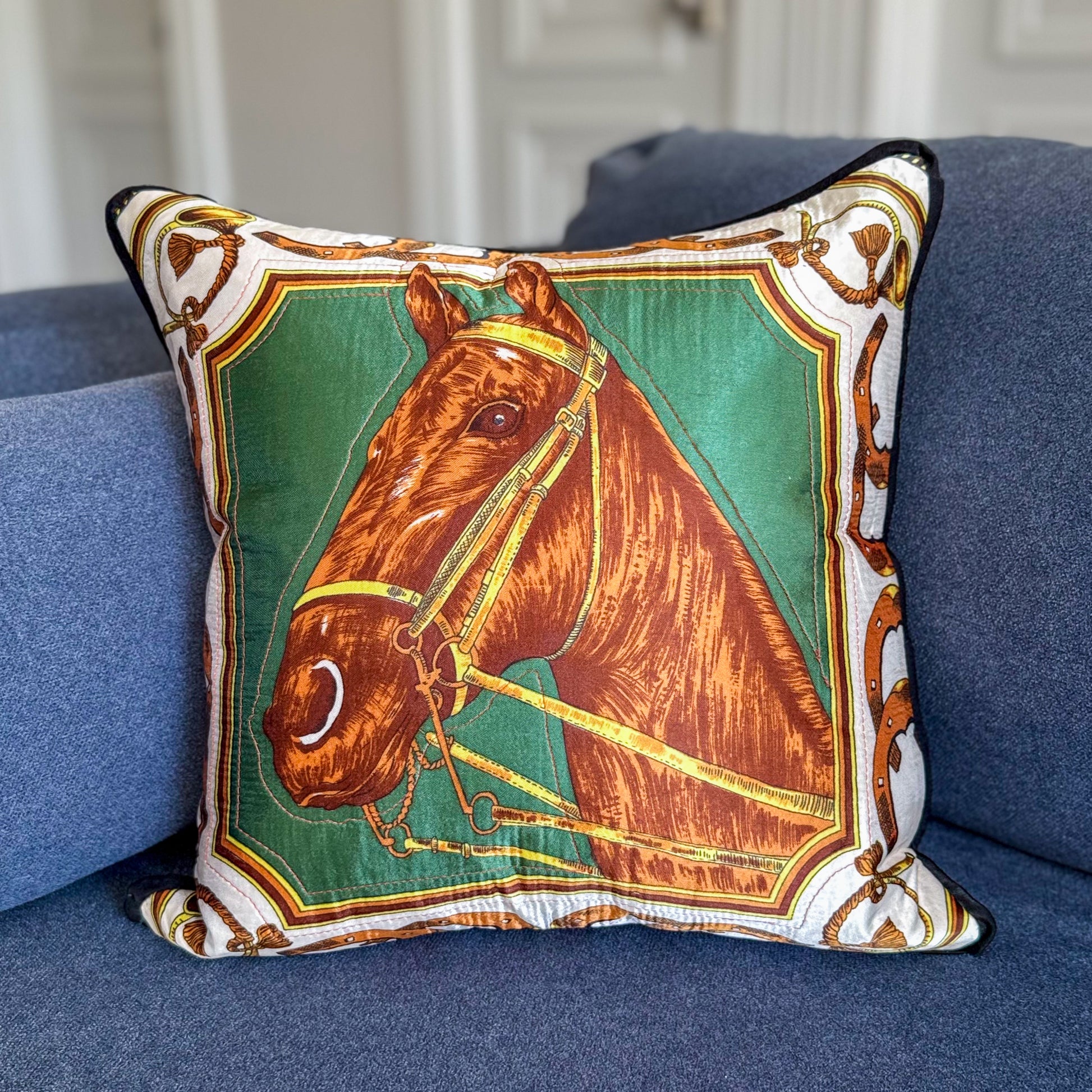 Transform your space with this unique upcycled scarf throw pillow featuring a rustic horse pattern and equestrian print design, now repurposed as an elegant home decor cushion. The black piping accent adds a touch of sophistication to this versatile housewarming gift, perfect as a bedroom accent piece or living room comfort companion.