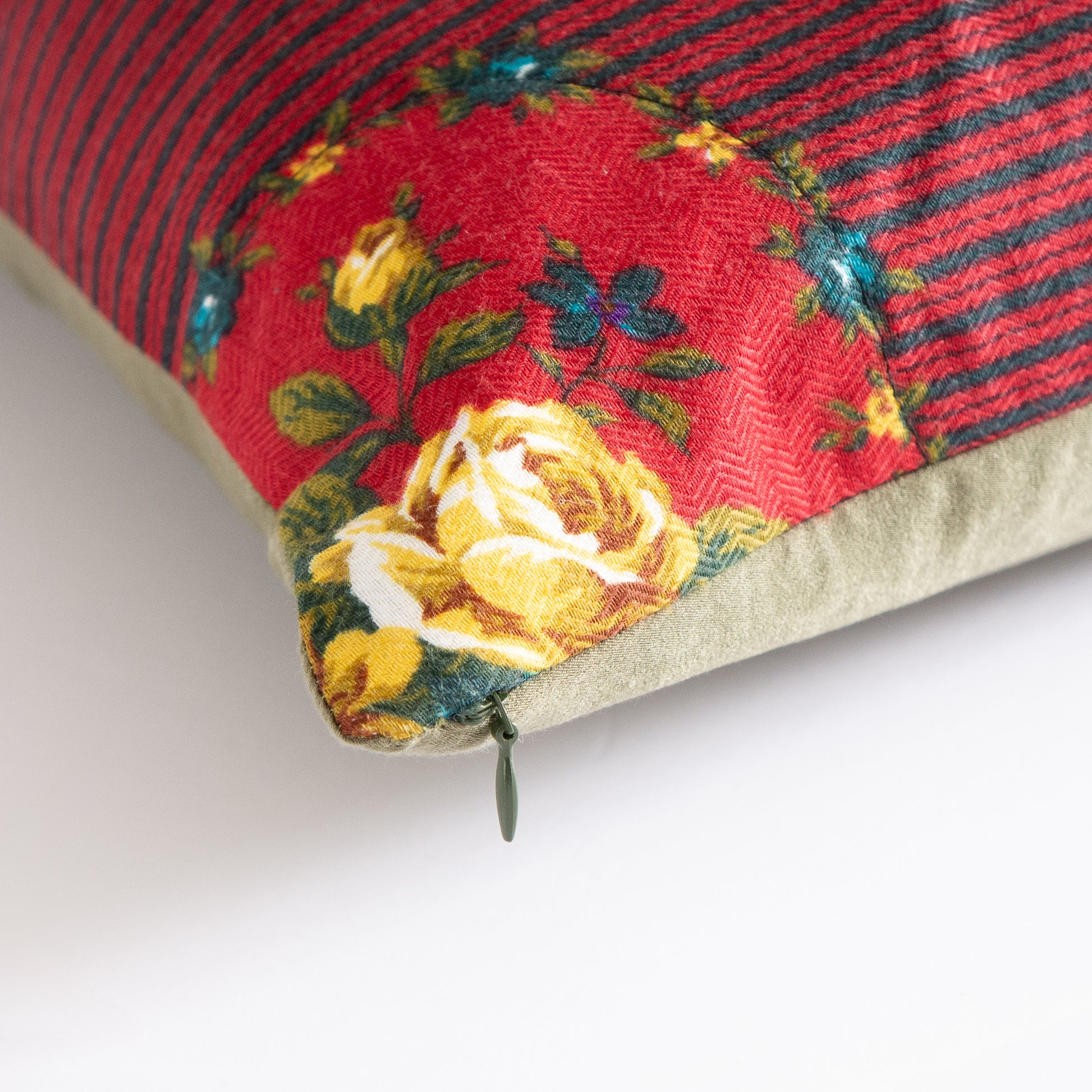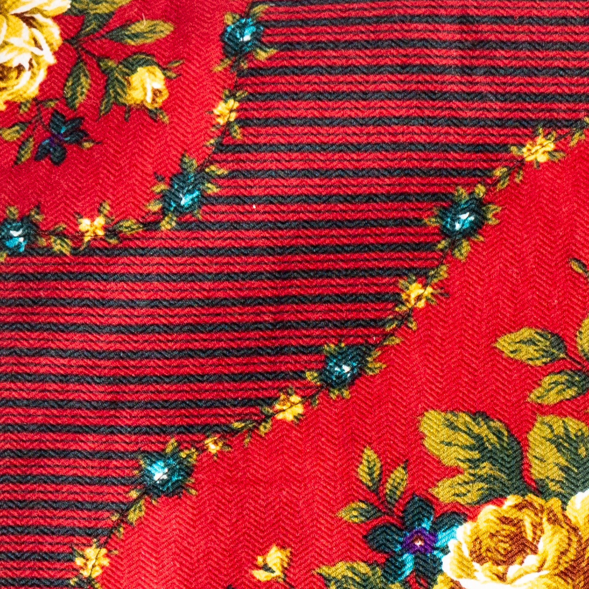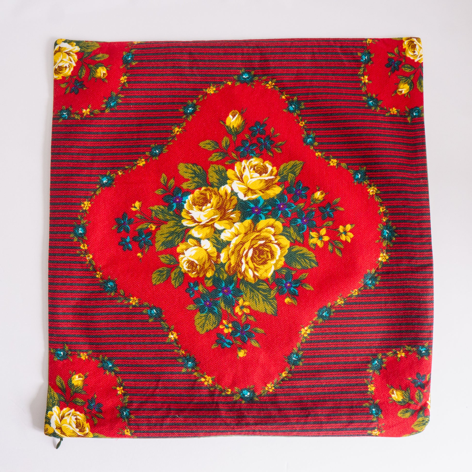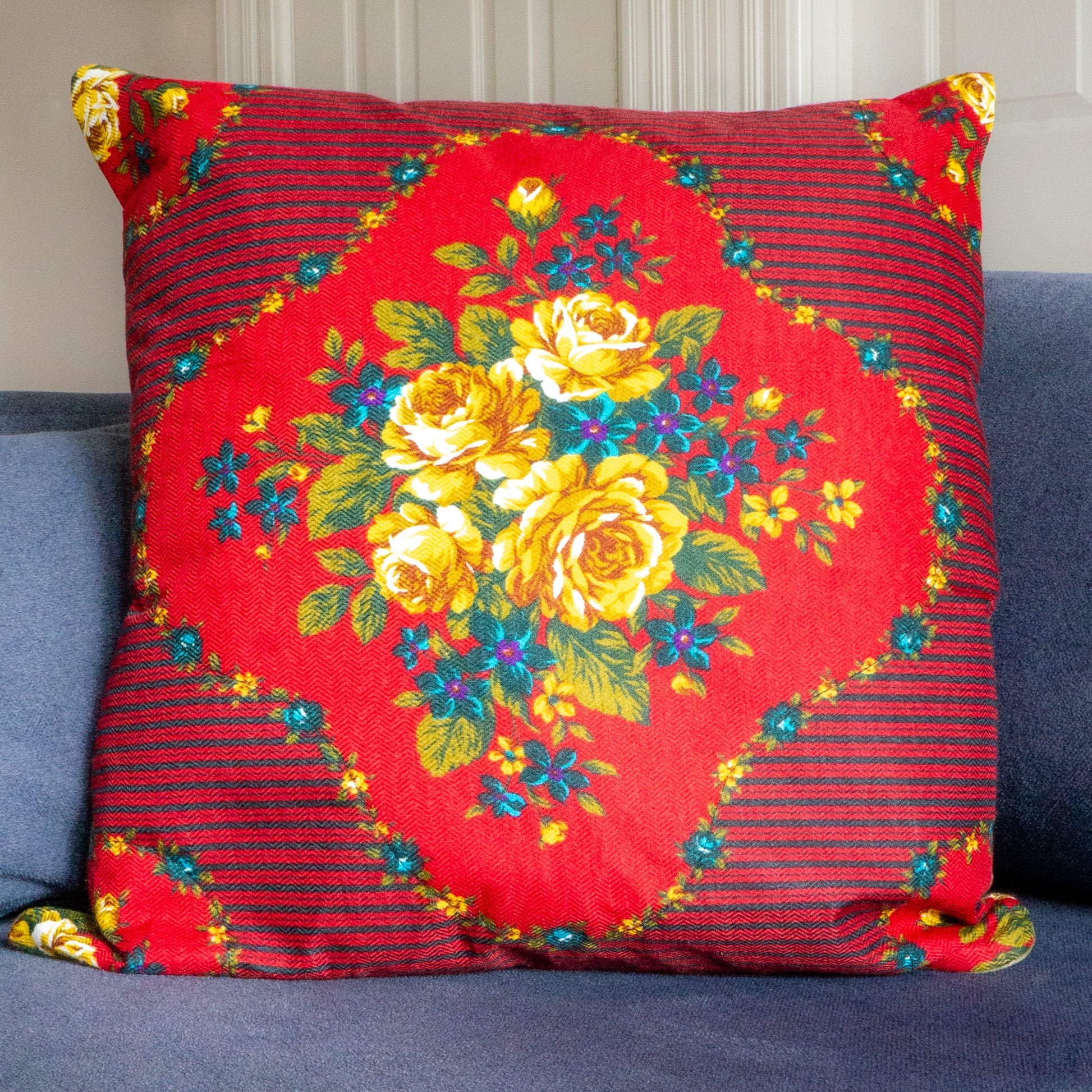Elevate the style of your living room with our stunning Yellow Rose Print Throw Pillow Cover. This upcycled fabric pillow cover features a beautifully handcrafted floral pillow cover made from a Rose print vintage scarf and backed with Global Recycled Standard Certified polyester brushed sueded faille fabric. Made with high-quality materials, this decorative pillow is not only aesthetically pleasing but also a great eco-conscious product choice for your home. Update your living room decor for spring with this unique rose print throw pillow. Shop our collection of upcycled vintage fabric throw pillows to find the perfect statement piece for your home.