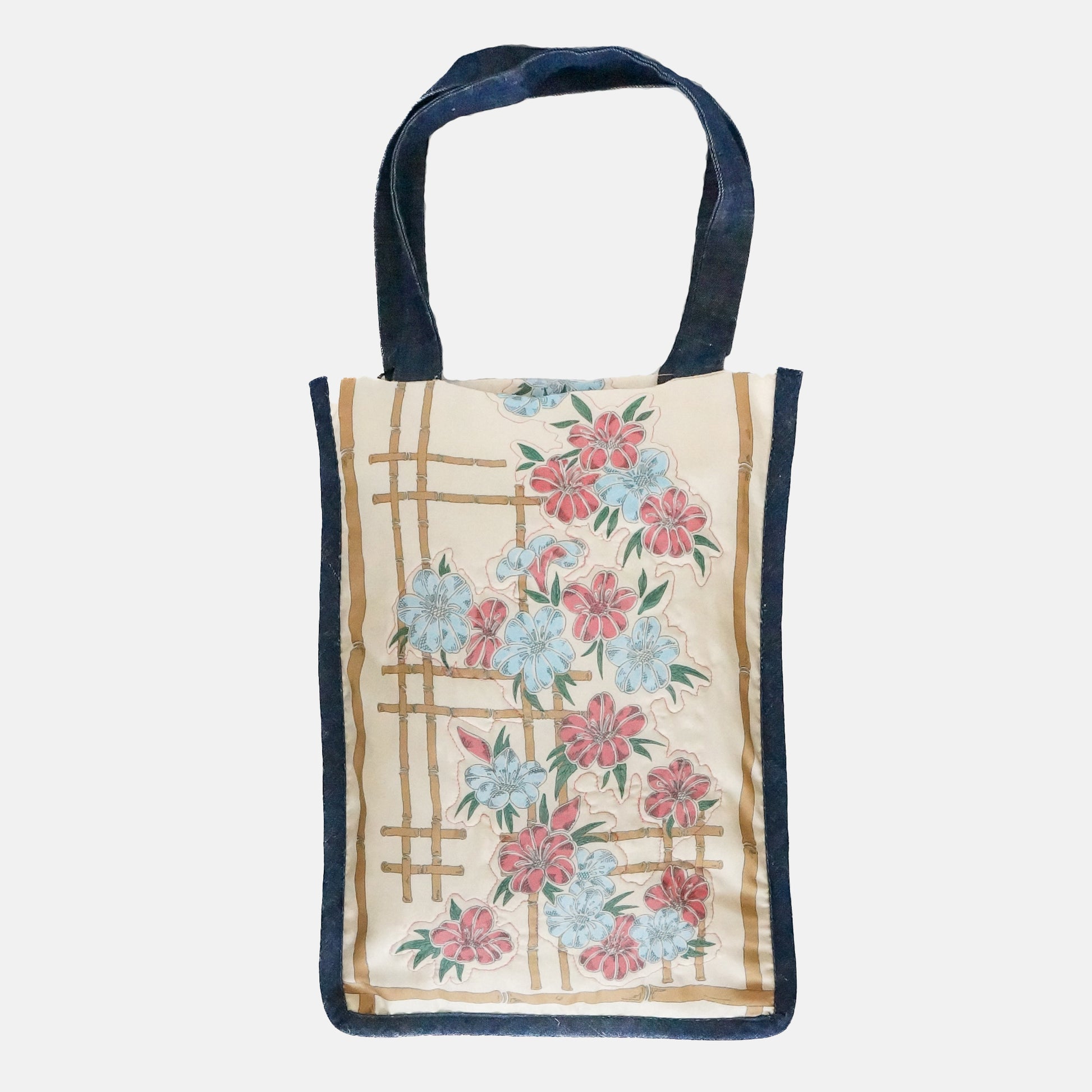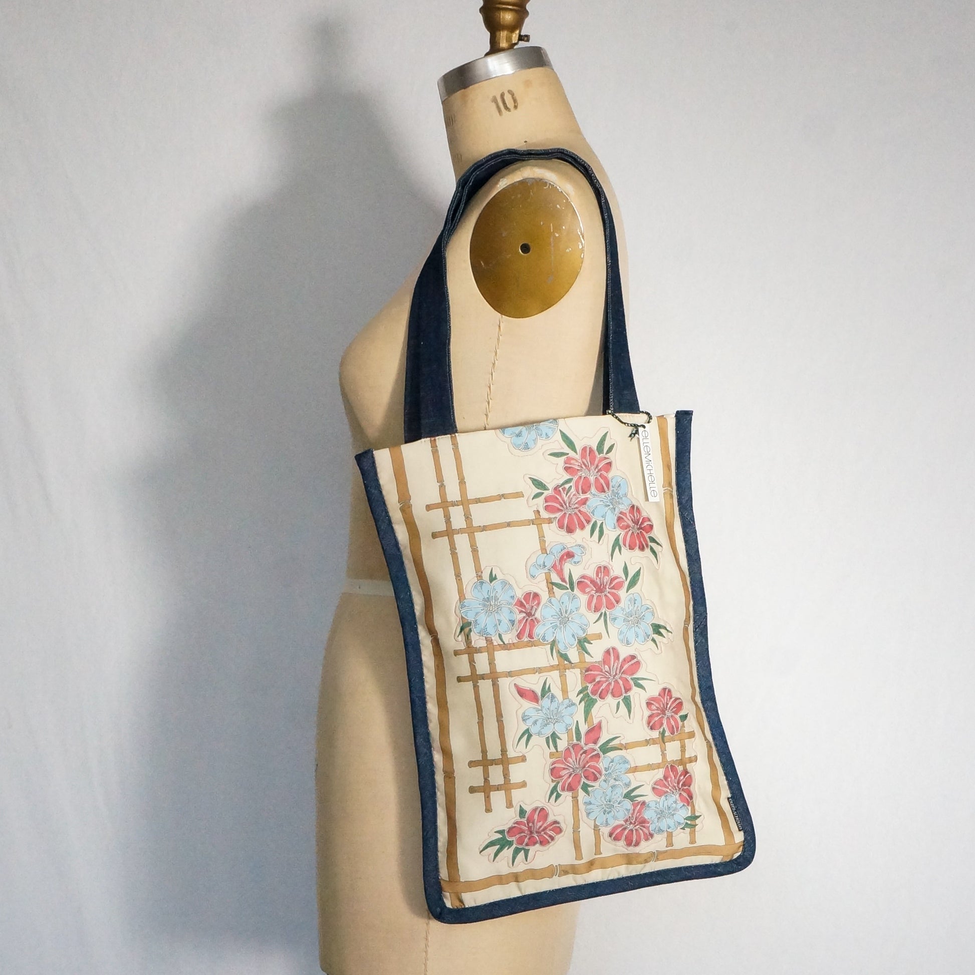 A beautiful vintage floral print scarf upcycled into a unique statement making tote bag, perfect as a gift for the shopping enthusiast or book reader seeking a stylish summer carryall. This versatile fabric carrier features a distinctive vintage floral print and durable denim handles and binding , creating a retro print purse that embraces sustainable fashion.