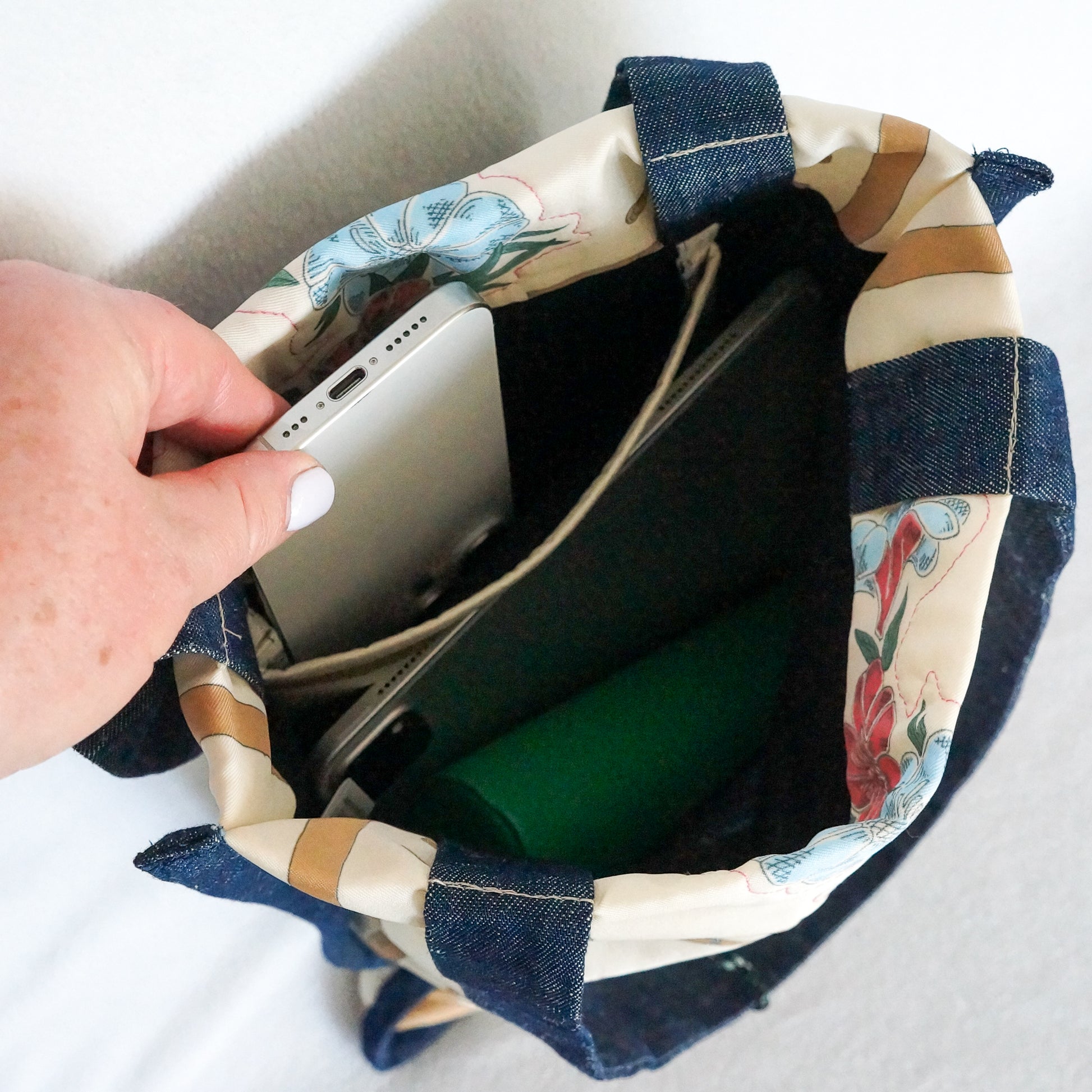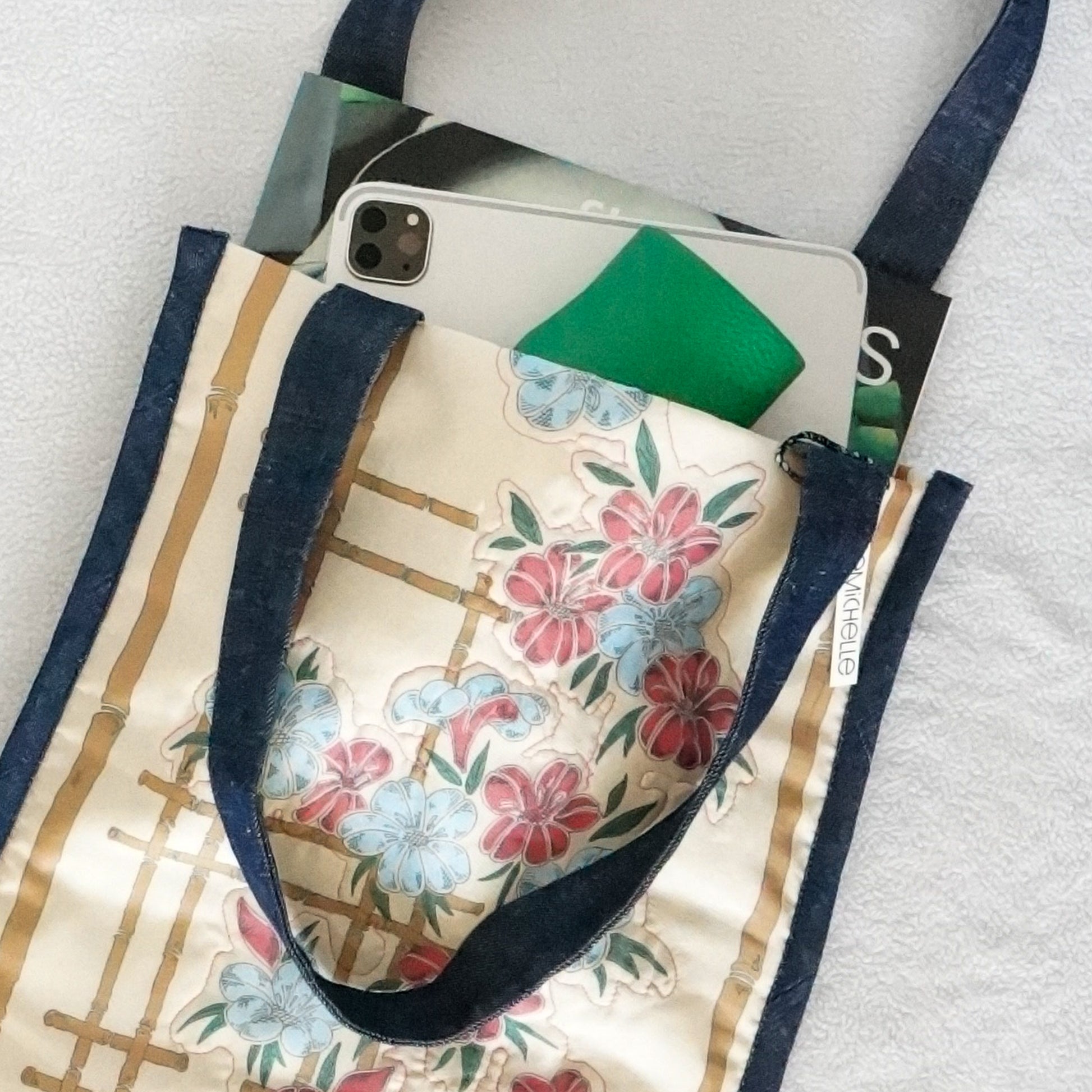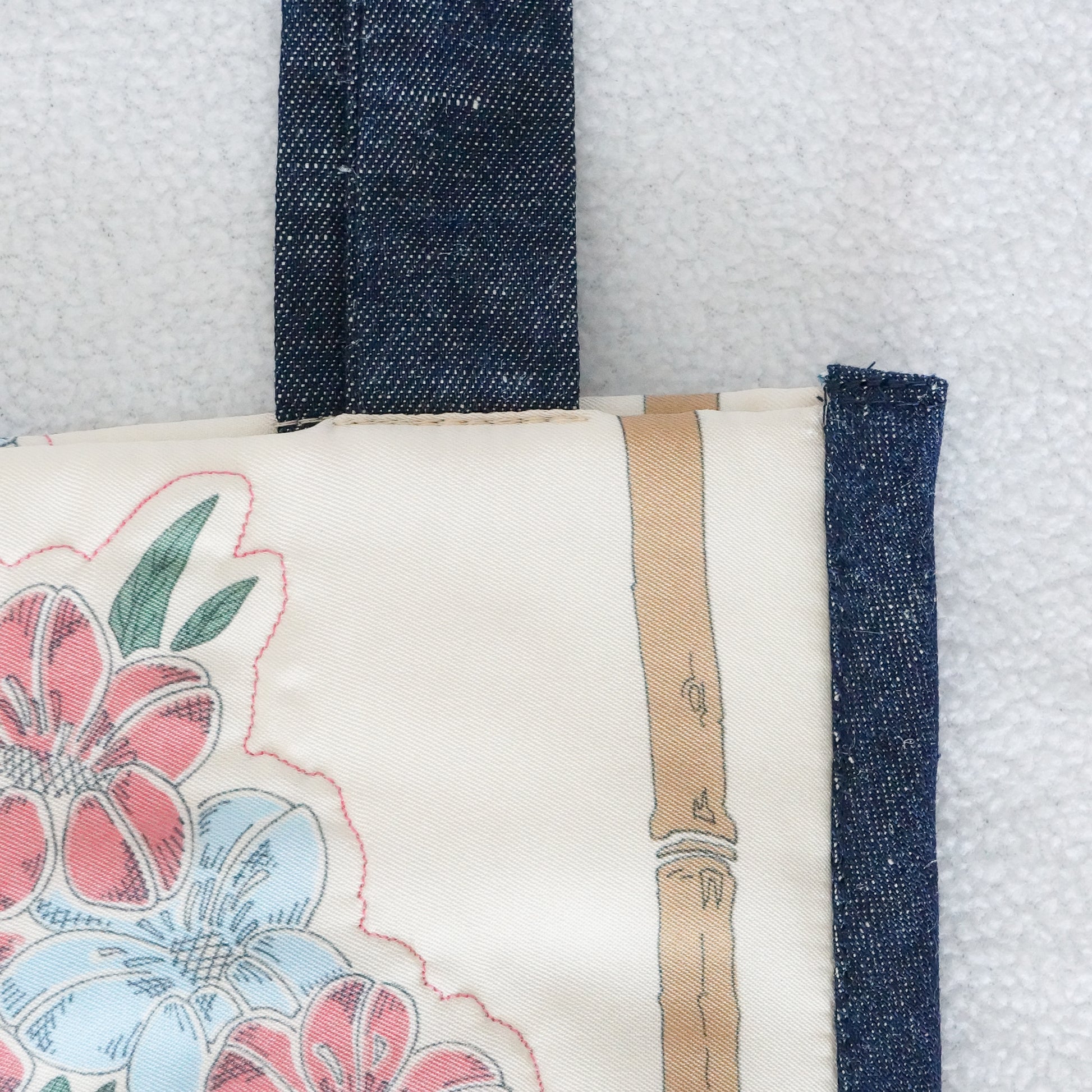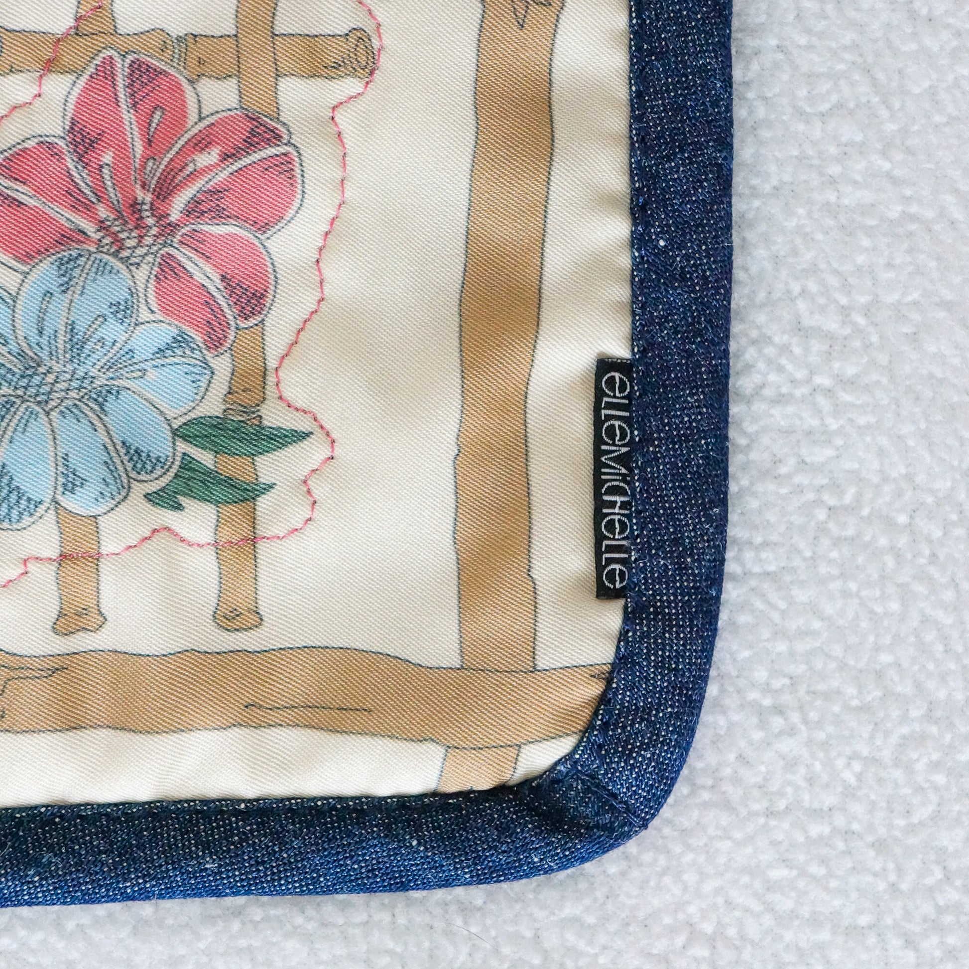 * Navy blue denim handles and binding around the edges for durability