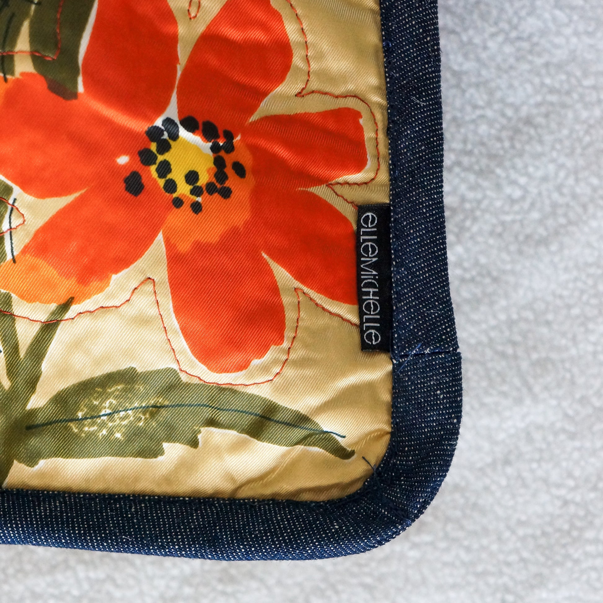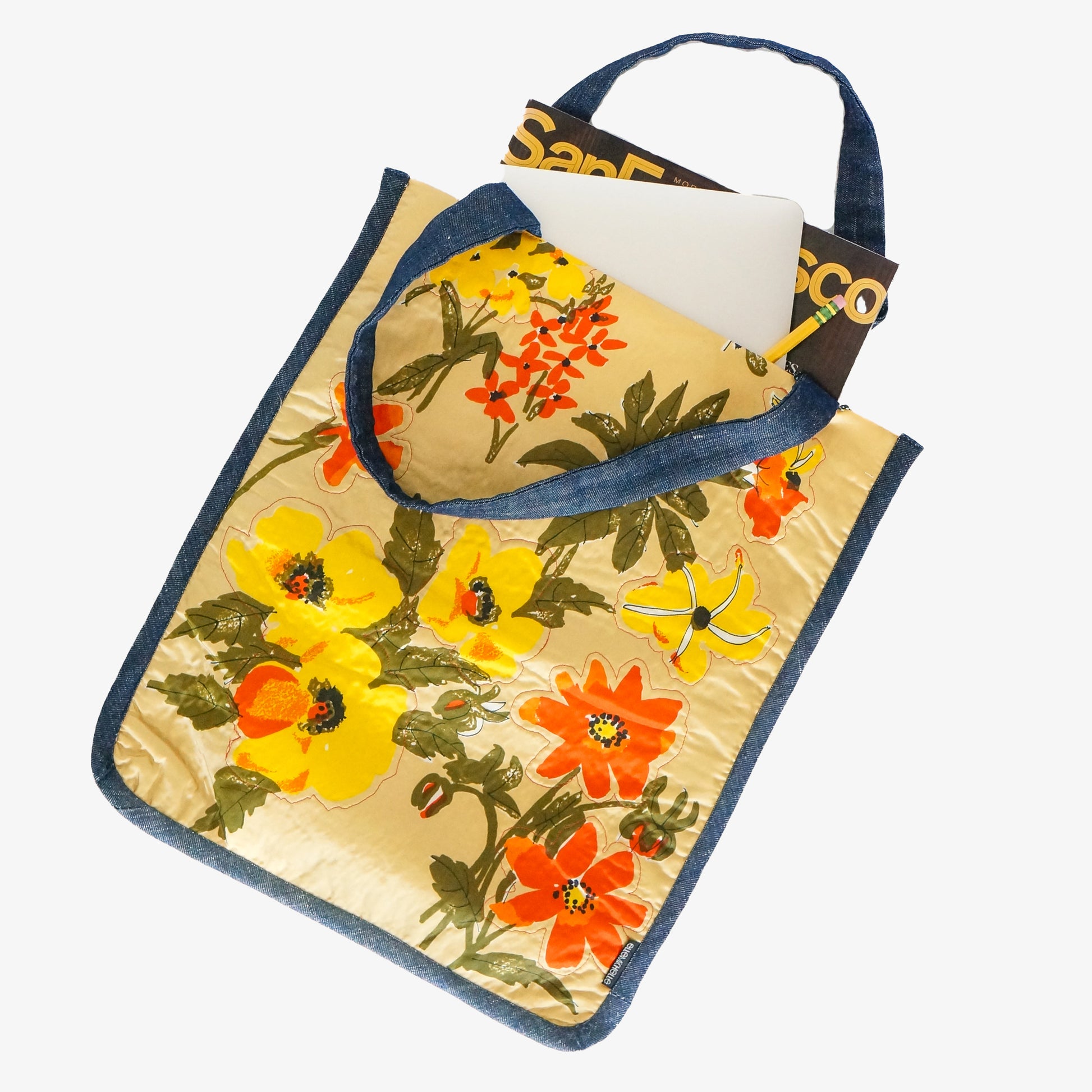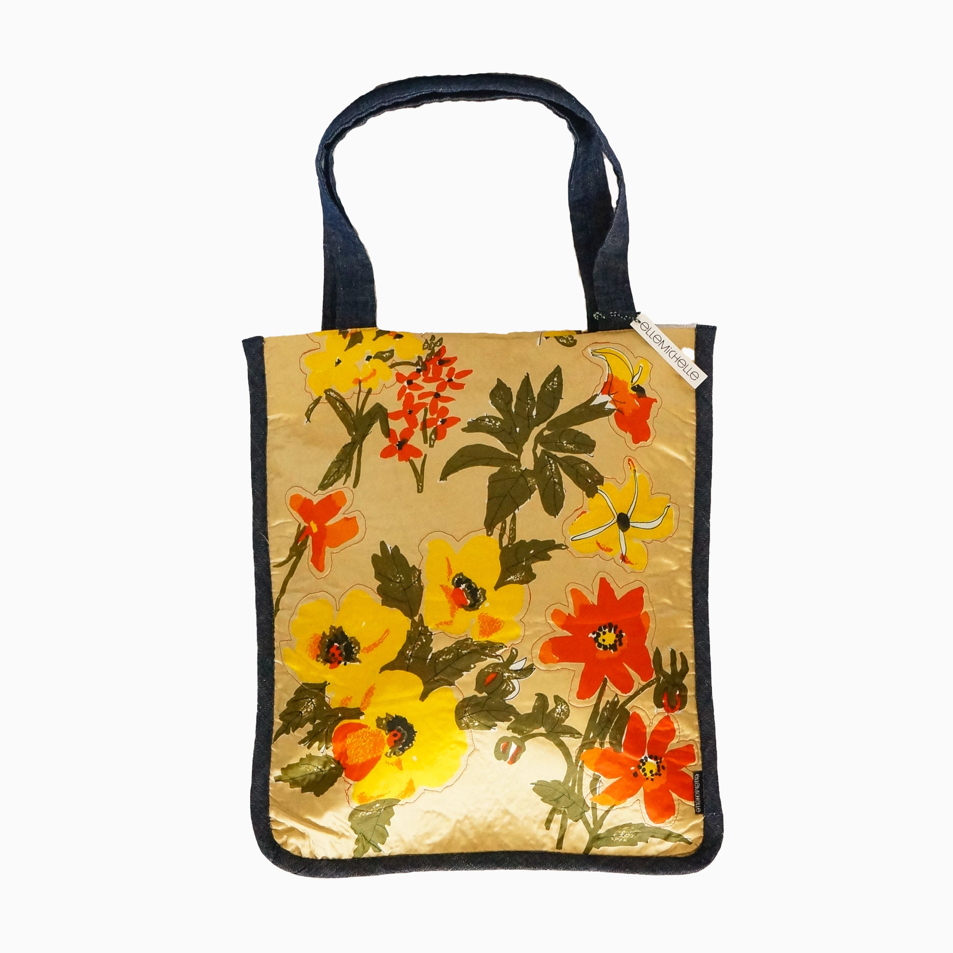 A cherished vintage floral print scarf upcycled into a unique statement making tote bag, perfect as a gift for the book enthusiast or beachgoer seeking a stylish summer carryall. This versatile fabric carrier features a distinctive vintage floral print and durable denim handles and binding , creating a retro print purse that embraces sustainable fashion.