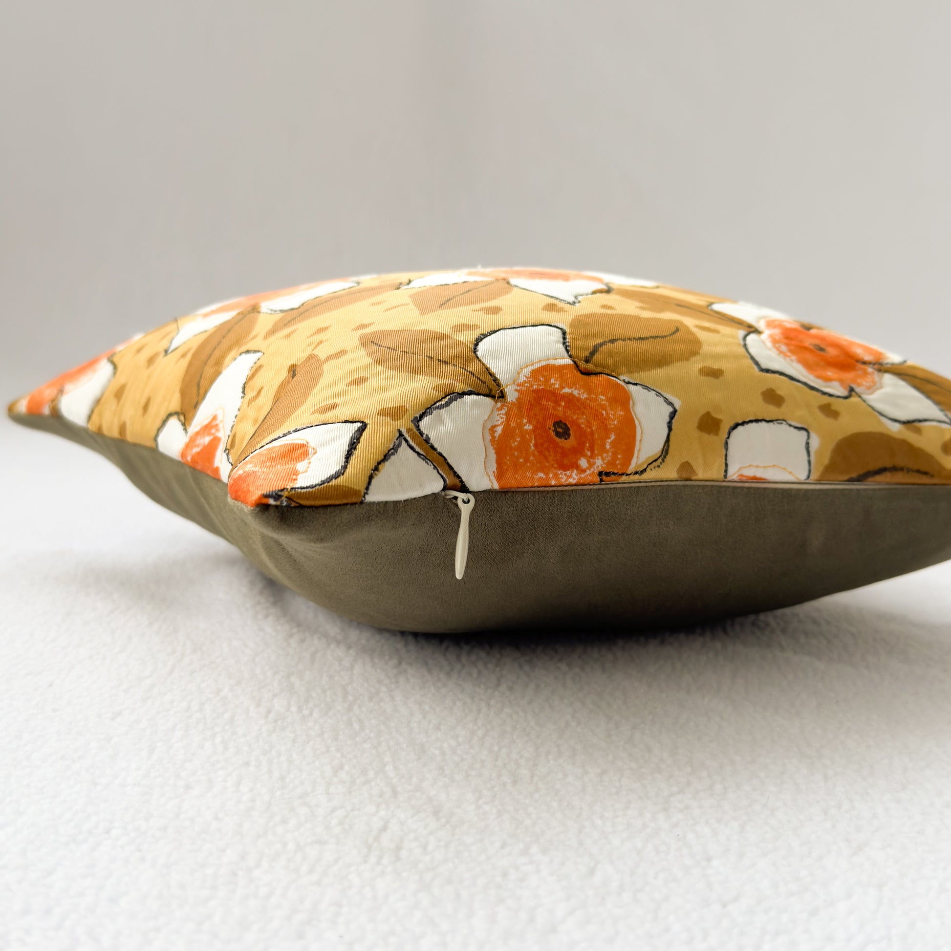 Brighten your space with this unique upcycled vintage scarf throw pillow featuring a beautiful orange and yellow retro floral pattern, now repurposed as an elegant home decor cushion. The perfect statement pillow to add a pop of color to any corner in your home.